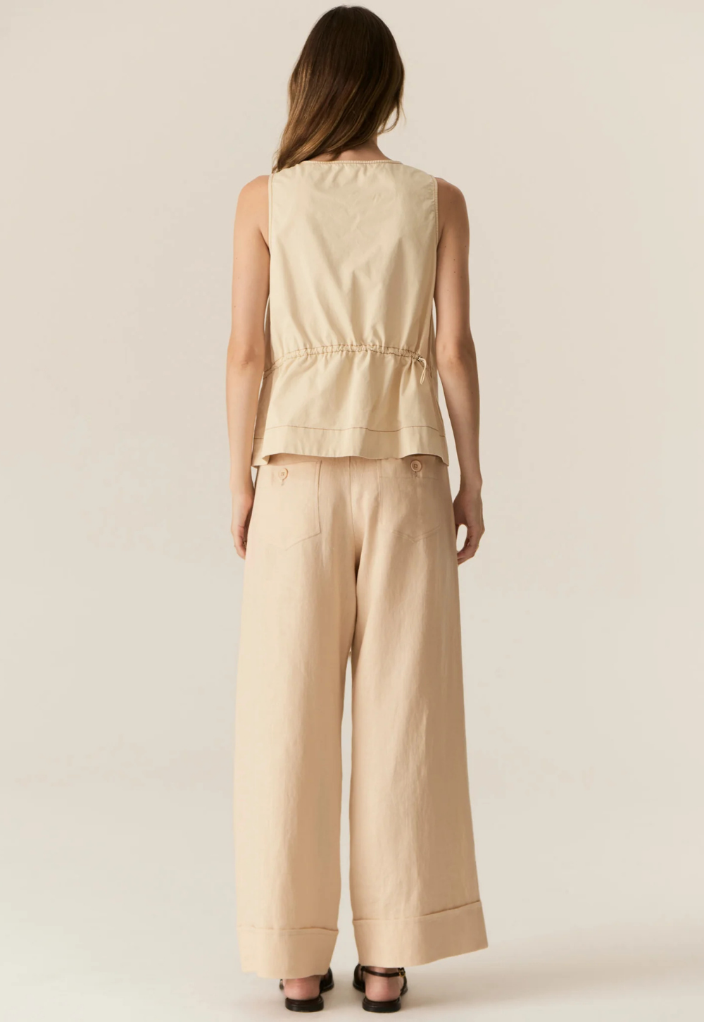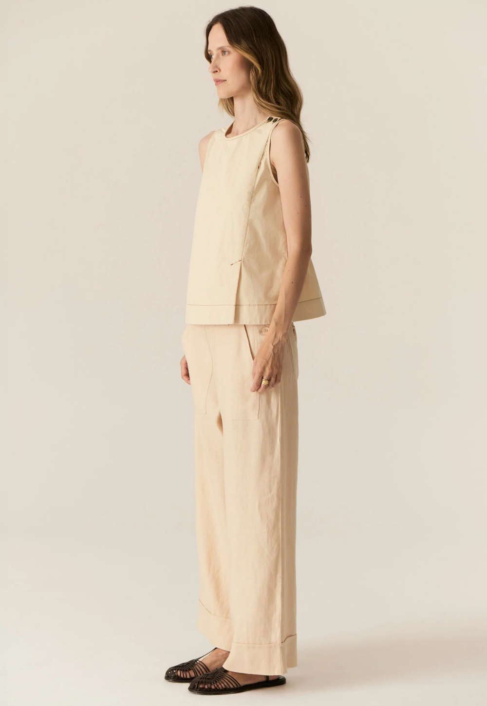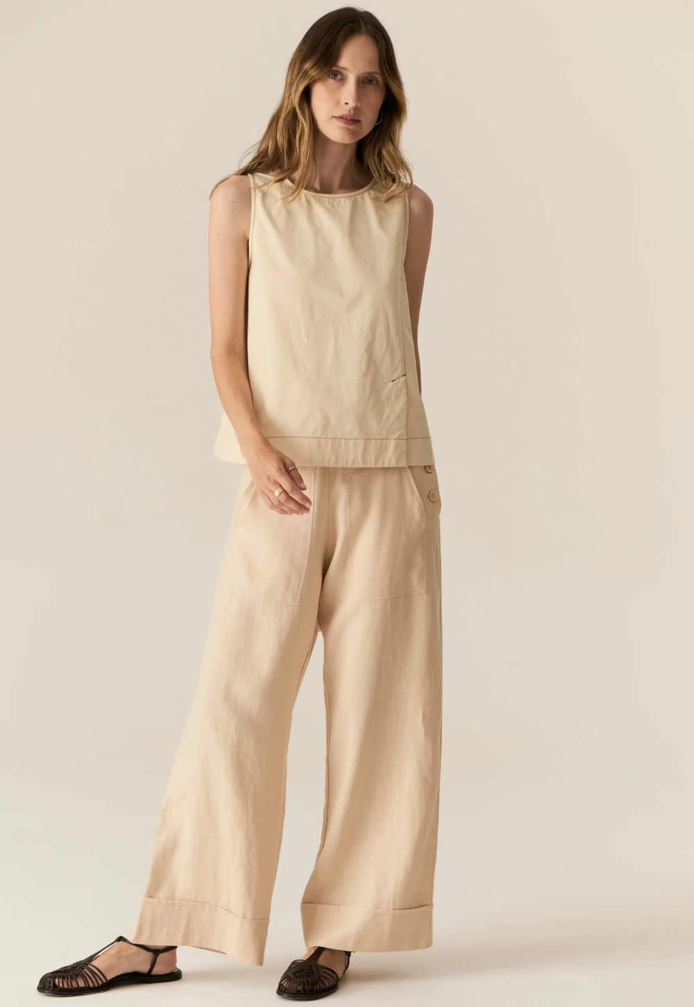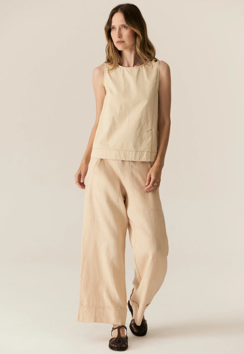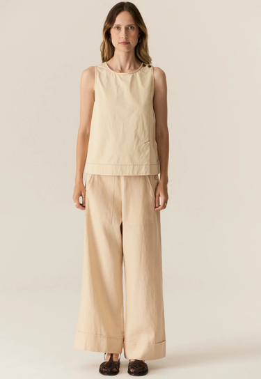 Clean, modern, and thoughtfully detailed. The Avrid Tank by POL is an updated take on a bestselling silhouette, designed to be worn loose or gently drawn in at the waist. Crafted in crisp cotton with a paper-finish feel, it holds its shape beautifully while offering an effortless, relaxed look. Subtle asymmetric details and contrast topstitching give this sleeveless style a contemporary edge, perfect for everyday wear.